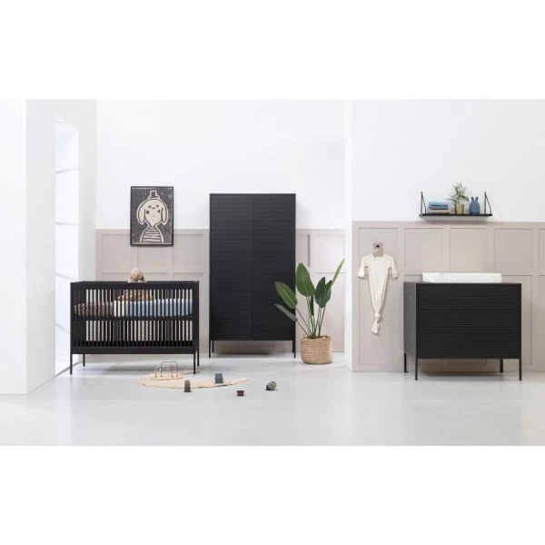 De Europe Baby Liam Babykamer Zwart is een stijlvolle kamer welke zich kenmerkt door de moderne strepen structuur. Het ledikant is verstelbaar in 3 verschillende hoogtes en de commode beschikt over 3 ruime laden. Verder is de commode voorzien van het push to open en soft close systeem. De meubels van de Liam kamer zijn gemaakt van massief beuken en hoogwaardig plaatmateriaal. Een tijdloze kamer voorzien van een strak design met voldoende opbergruimte.